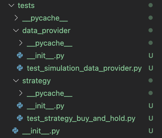 setting.json을 재설정하여도 vscode의 테스트에서 테스트 파일을 제대로 찾지 못할 것이다. 그 이유는 테스트 디렉터리에 __init__.py가 없기 때문이다. unittest discover가 작동하기 위해서는 모든 테스트 디렉터리에 __init__.py파일이 있어야 한다.